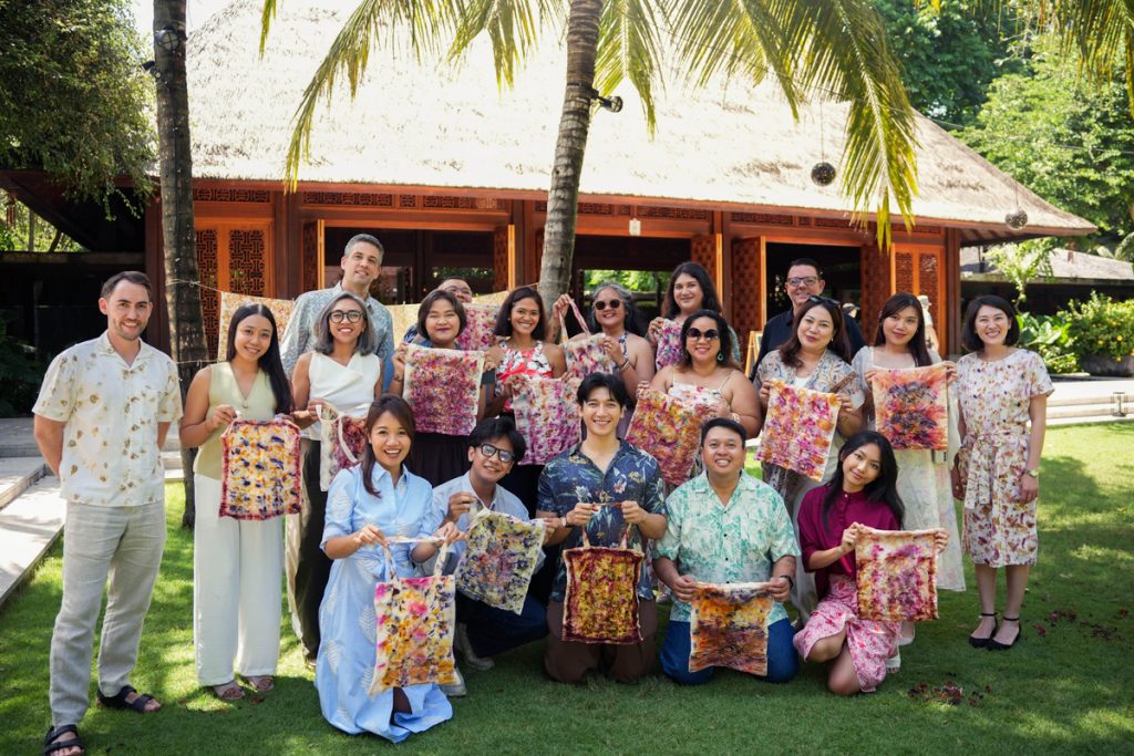 Pengalaman dimulai dengan langkah santai menuju Herb Garden, kebun herba yang tersembunyi di dalam kompleks resor dan menjadi salah satu jantung ekologisnya. Di sinilah berbagai tanaman aromatik dan botani tumbuh, tak hanya untuk memasok kebutuhan dapur, tetapi juga sebagai sumber inspirasi kreatif. Menggunakan dedaunan dan bunga yang dipetik langsung dari kebun, serta koleksi tanaman kering dari Crea Botanica, para undangan pun larut dalam proses mewarnai tas kain putih—sebuah aktivitas yang terasa meditatif, sekaligus membuka kembali kesadaran akan asal-usul material yang kita gunakan setiap hari.